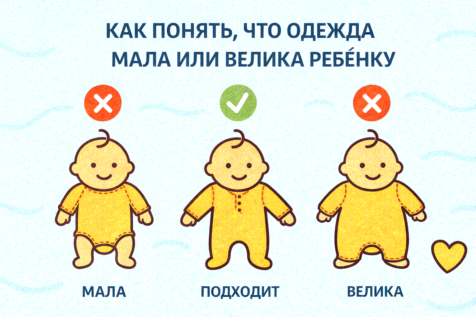 Важно: это очень усреднённые данные. Крупные дети могут перескочить 56-й размер совсем. Миниатюрные — носить один размер дольше. Как правильно снять мерки и определить нужный размер — в гиде как определить размер одежды для новорожденного.